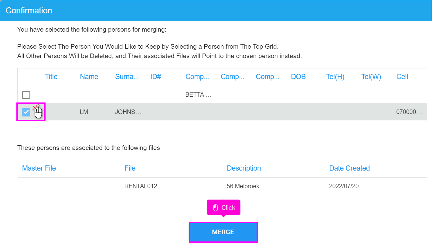 2. Contact Merge screen will open. Select the contact to become the Master Record by ticking the tick box and click Merge. All other contacts will be deleted, and their associated files will point to the new selected contact instead.