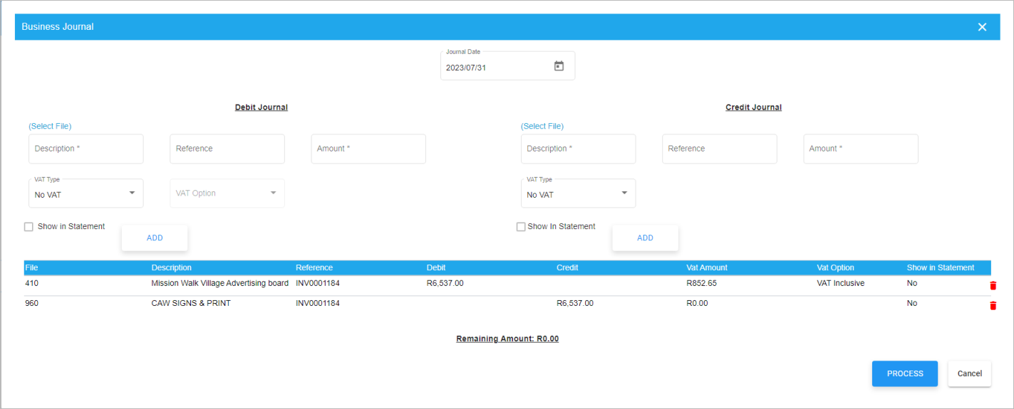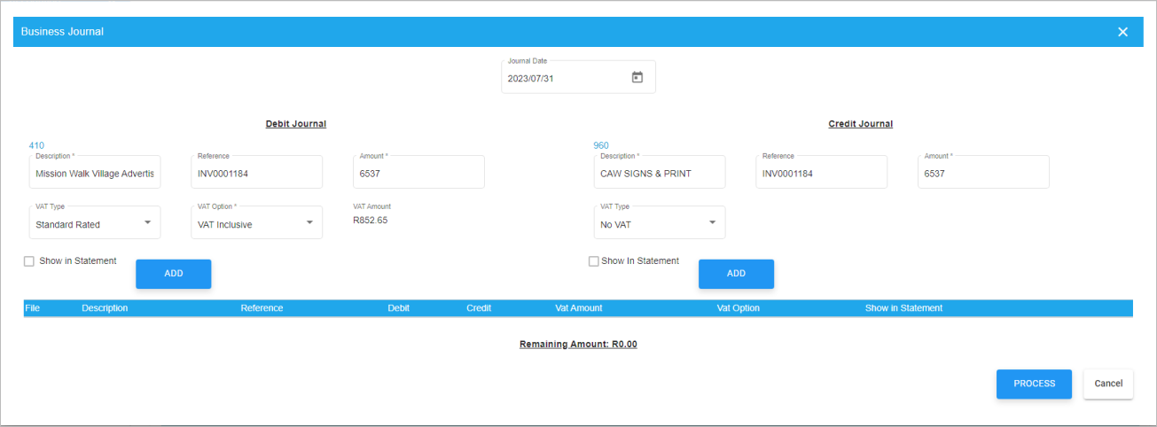 Once you have done this you click the two ADD buttons and the two transactions line will be found below the blue menu ribbon.