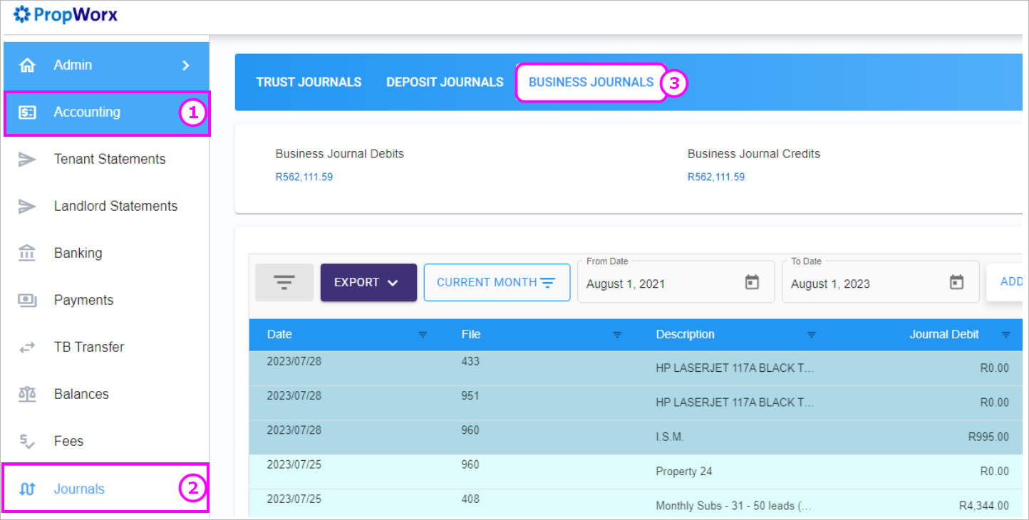 So, in PropWorx there will be a Debit Journal and a Credit Journal side by side on the page that will open up when you select BUSINESS JOURNALS on the menu