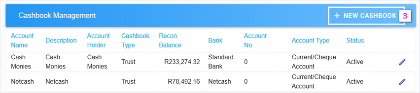 1. Follow the steps to access Cashbook Management, then click on the + New Cashbook button.