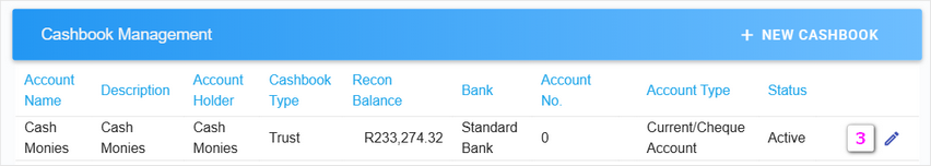 1. Follow the steps to access Cashbook Management, then click on the Pencil Icon (
