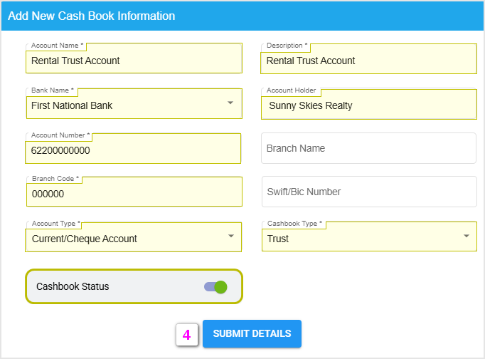 3. Click on Submit Details Button. Cashbook will be created and will be loaded to cashbook list.