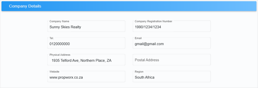 PropWorx is designed for a single legal company entity. All online portals and internal systems display the same company details. While multiple bank accounts can be managed, certain elements—such as the VAT number, logo, and footer—remain universal across the database.