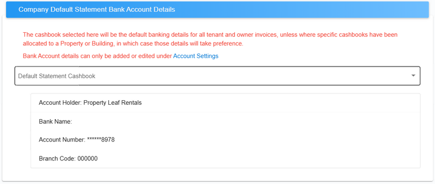 • Default Company Statement Bank Account Details: These are the default bank details that will appear on your tenant and landlord statements. Important: Before you can select a bank account here, you must first create it as a cashbook within PropWorx. (See the Create Cashbooks section for more details.)