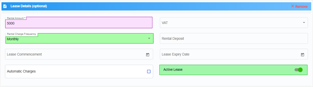 Click on Add Lease button. Lease details fields will appear, all fields are optional except for Rental Amount (mandatory) but should be prepopulated when inserted under mandate.