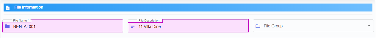 Type in the File Name (is used by the tenant for rental payment e.g., RENTAL001) and File Description (is quick reference of the property e.g., 11 Villa Dine).