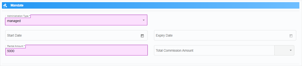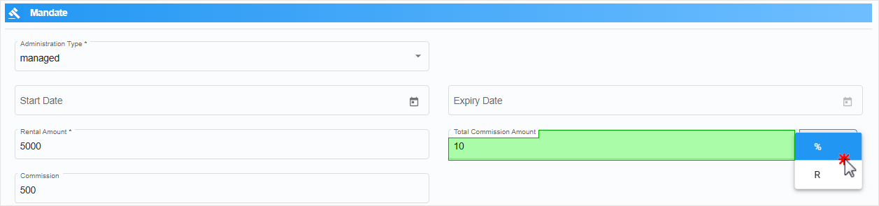 Mandate: Select mandate type and Rental Amount(mandatory)