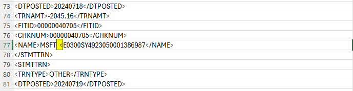3. In the OFX file, locate the same row (use the FIND function to quickly navigate to that row). Delete the problematic character (you may replace it with a space).