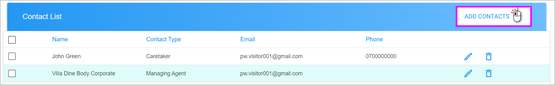 7. Scroll to the Contact List Section. Click Add Contacts.