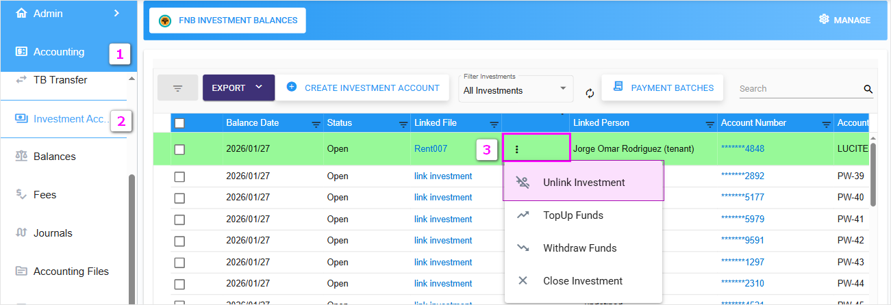 Note: Unlinking a deposit does not release the funds from the investment; it simply unlinks the balance from the file, allowing the user to link it to a different file. Step 1: Go to Accounting, then Investments Accounts. Step 2: Look for the ...