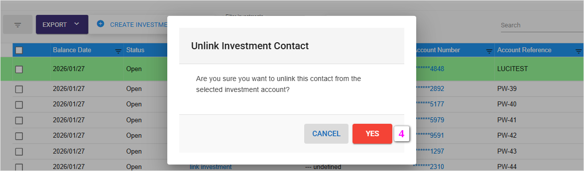 Step 4: On the prompt select Yes. The investment will be unlinked from the customer file. User can now link to a different file if required.