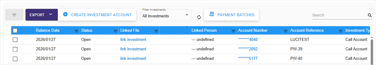 Note: Creating a new investment will trigger an instruction for creation. Please allow two business days for the investment account to be created. Step 1: Go to Accounting, then Investments Accounts. Step 2: Look for the relevant deposit. Step 3: ...