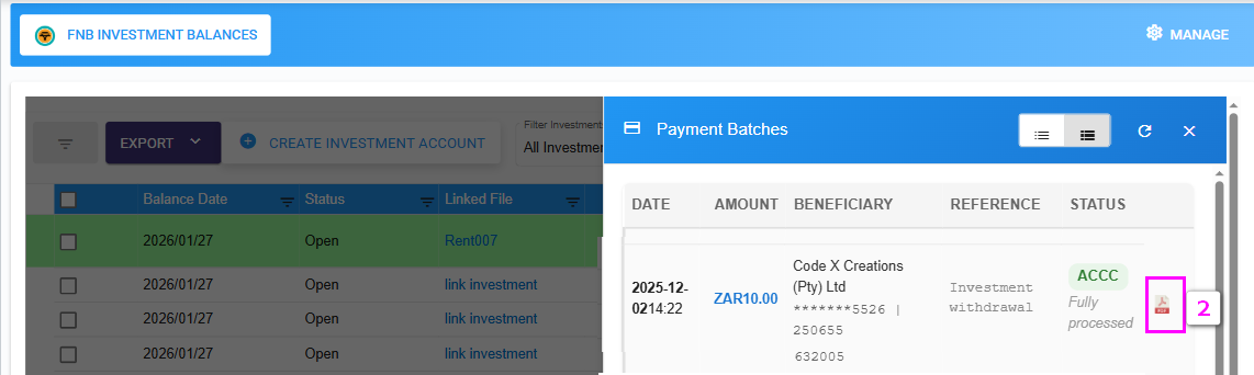 Note: The deposit proof of payment will only be available once the deposit has been released from the bank. This proof of payment reflects the transfer from the PropWorx investment account to the selected bank account as instructed in the withdrawal. It does not show the original deposit payment made by the tenant.