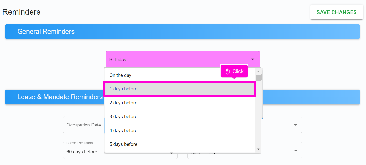 Propworx will remind you about certain events (i.e., birthdays). You can select how many days in advance you would like to be reminded for each reminder.