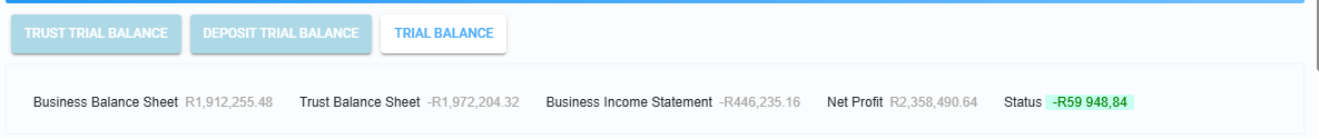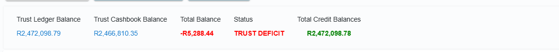- Status is Deficit on Trust Trial and Deposit Trial Balance reports: Indicates if too much money was overdrawn after the Trust to Business transfer. If it is in debit, the funds need to be paid back to the trust from business.