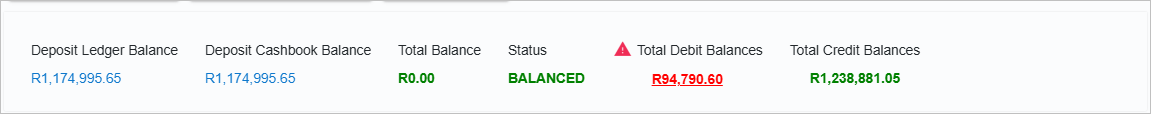 - Total Debit Balances on Trust Trial and Deposit Trial Balance reports: Shows the total amount of deficits across the ledgers on the trust or deposit balance report.