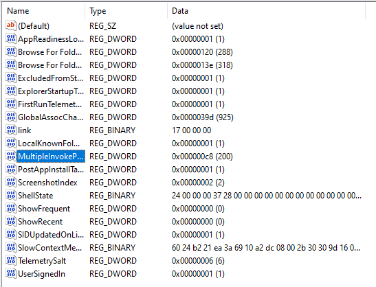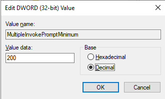(Create a new DWORD entry if it is not there in the list, by right clicking on an open space, select new then select DWORD (32-bit) Value. Then rename the entry to "MultipleInvokePromptMinimum")
