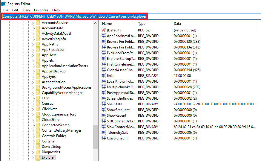 Step 2 – Navigate to the following path: HKEY_CURRENT_USER\ Software\ Microsoft\ Windows\ CurrentVersion\ Explorer
